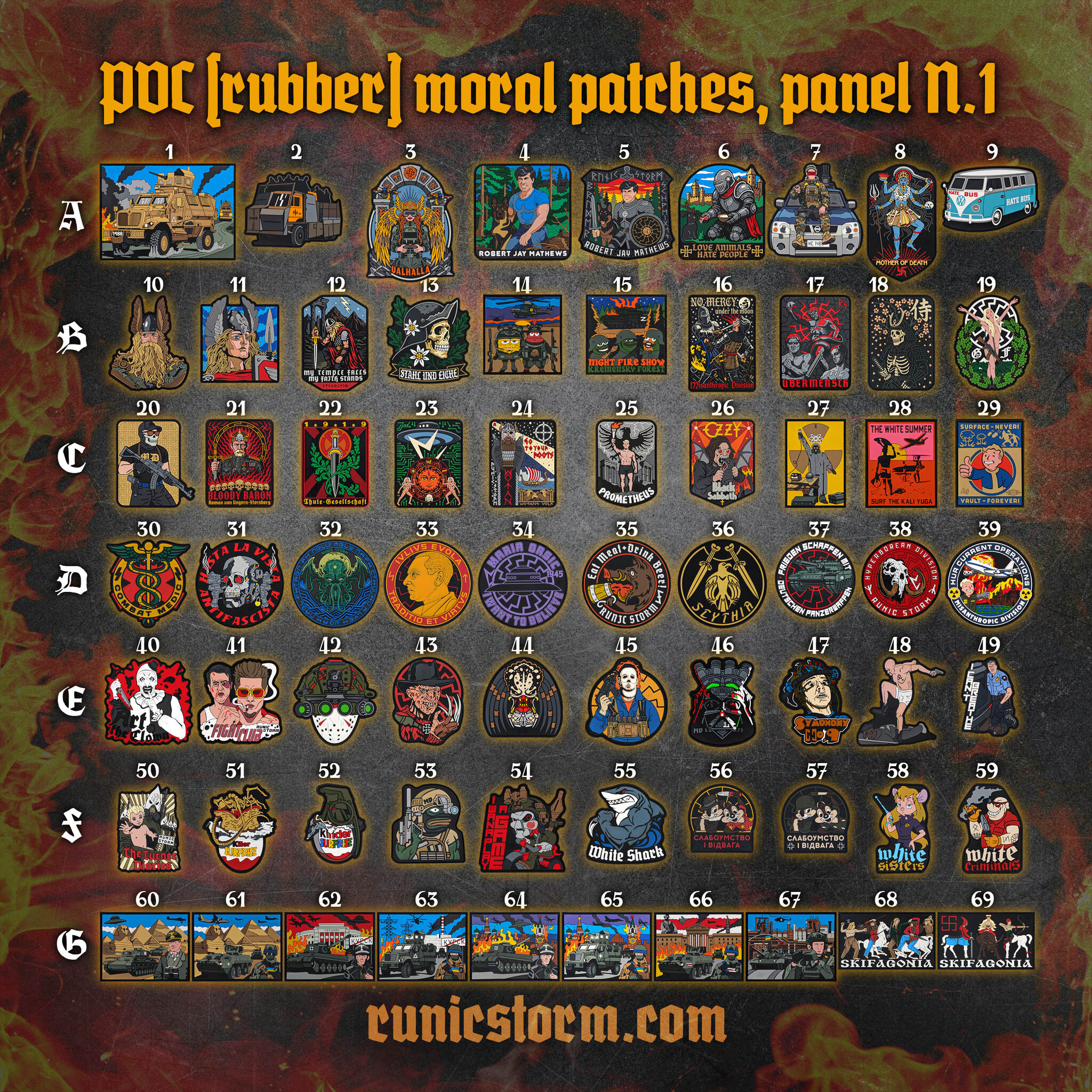 PVC (rubber) moral patches, panel №1 SKU: W011 Stock Status: 10 Delivery Status: 10-14 days Keywords: #patchpanel Number -- Select -- 01 - The «International MaxxPro» PVC patch +$7 02 - The «Honey Cake» PVC patch +$2 03 - The «Valhalla» PVC patch +$5 04 - The «Bob Mathews» PVC patch +$2 05 - The «Knight Bob Mathews» PVC patch +$2 06 - The «Love Animals Hate People» PVC patch +$2 07 - The «Hate MD» PVC patch +$12 08 - The «Kali Goddes of Death» PVC patch +$5 09 - The «Hate Bus» PVC patch +$2 10 - The «Wotan» PVC patch +$2 11 - The «Skandiniavian Warrior» PVC patch +$1 12 - The «Heitstrenging» PVC patch +$2 13 - The «Stahl Und Eiche» PVC patch +$1 14 - The «Sponge Bob and Patrick» PVC patch 15 - The «Night Fire Show Kremensky Forest» PVC patch 16 - The «No Mercy (MD)» PVC patch +$2 17 - The «Übermensch» PVC patch +$1 18 - The «Sakura Death Samurai» PVC patch +$2 19 - The «Greenline Front» PVC patch +$2 20 - The «MD-Mann» PVC patch +$1 21 - The «Bloody Baron» PVC patch +$1 22 - The «Thule Society» PVC patch +$1 23 - The «Vril Power» PVC patch +$1 24 - The «Go to your Roots» PVC patch +$1 25 - The «Prometheus» PVC patch +$1 26 - The «Ozzy Osbourne» PVC patch +$1 27 - The «Magician (Tarot)» PVC patch +$1 28 - The «The White Summer» PVC patch 29 - The «Surface - Never» PVC patch $9 Quantity Add To Cart Description There is no description for this product yet.