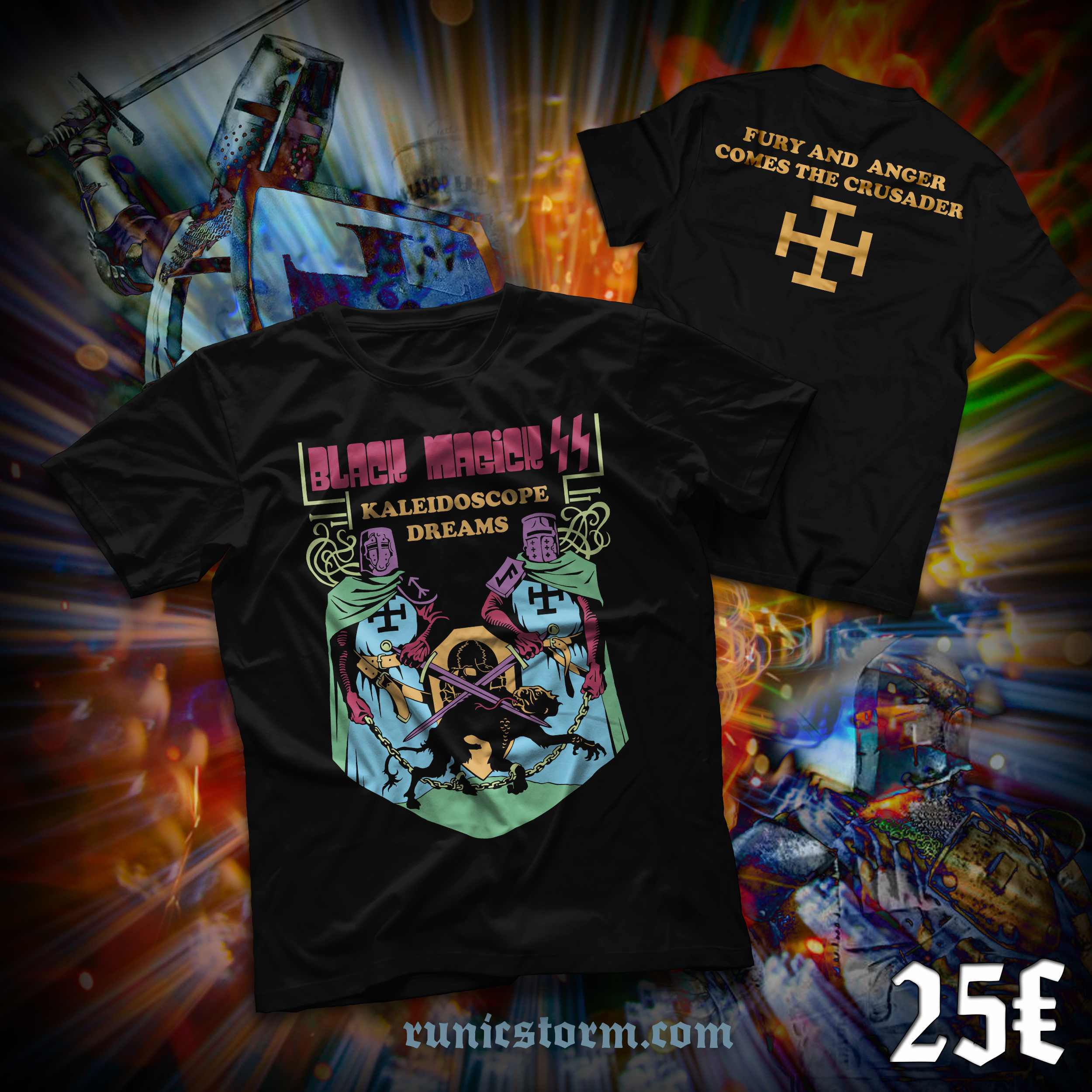 The spelling of the word "magic" in the form "magick" refers to the occult work of Aleister Crowley, with the SS standing for Schutzstaffel - a nod to their imagery.