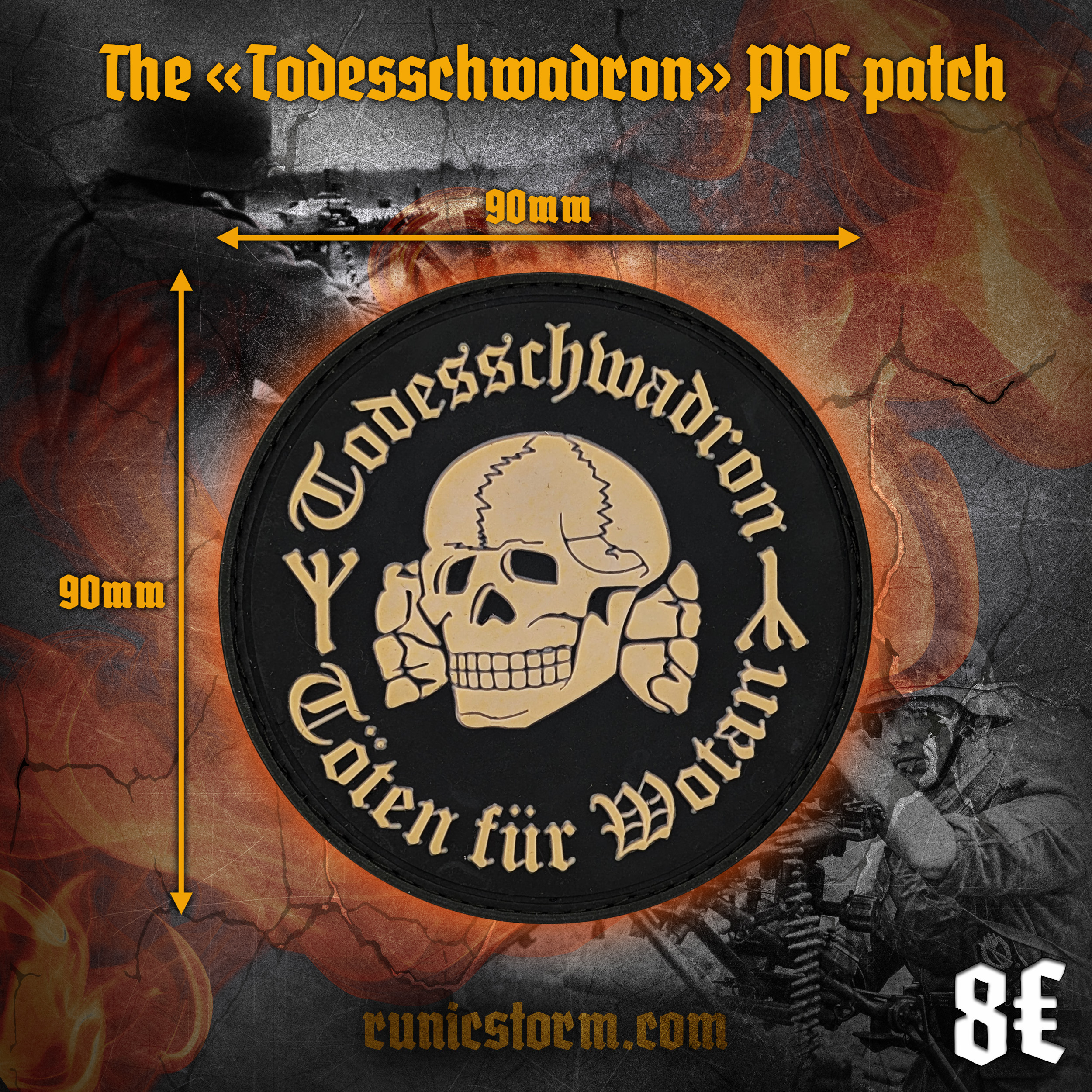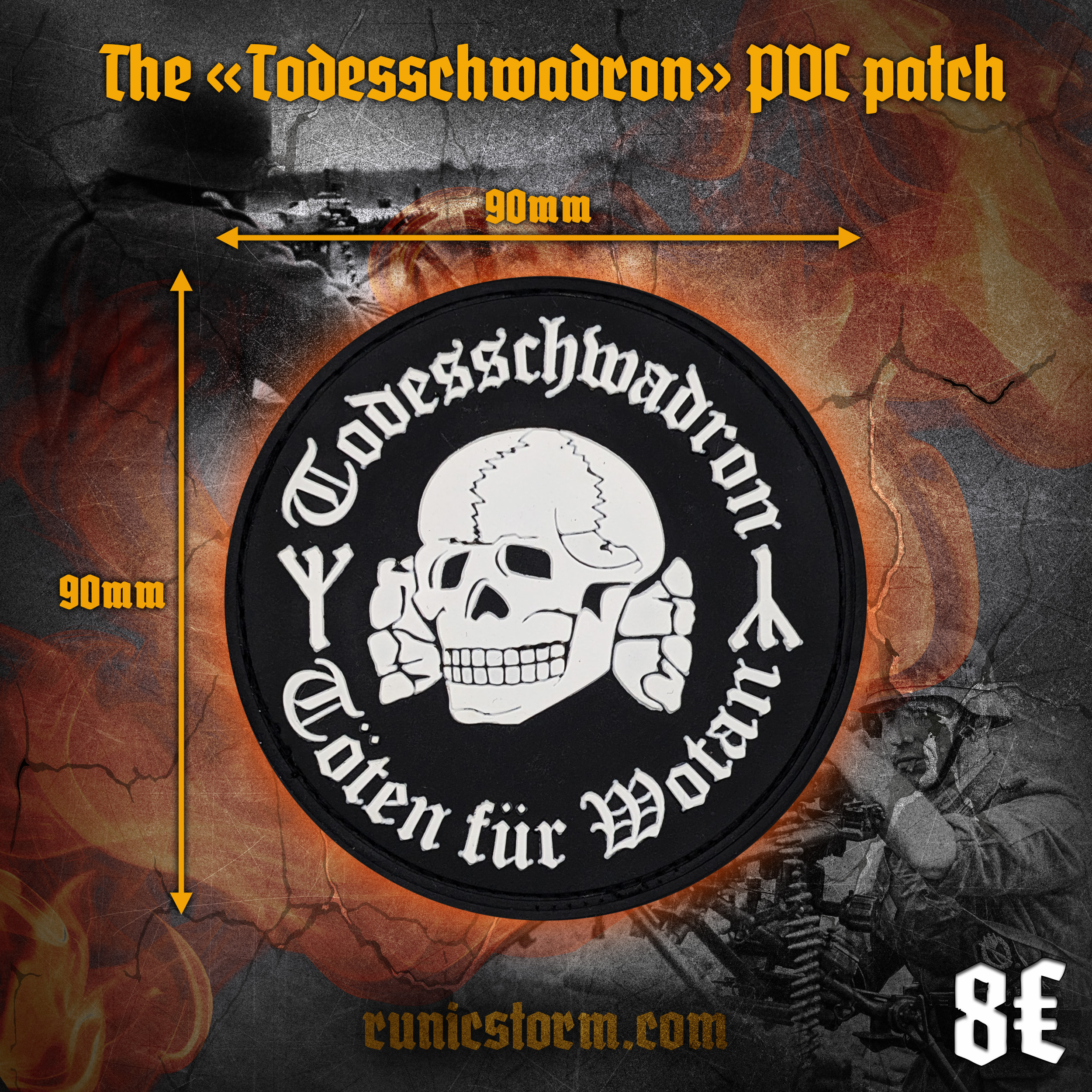 The «Todesschwadron» PVC patch #totenfurwotan Töten für W.O.T.A.N. ? Size: 90mm ? Limited edition: no Todesschwadron or death squad refers to an armed group that carries out extrajudicial killings. ? Over 18 y.o. only ? Runic Storm accepts payments via: paypal.com, wise.com, revolut.com