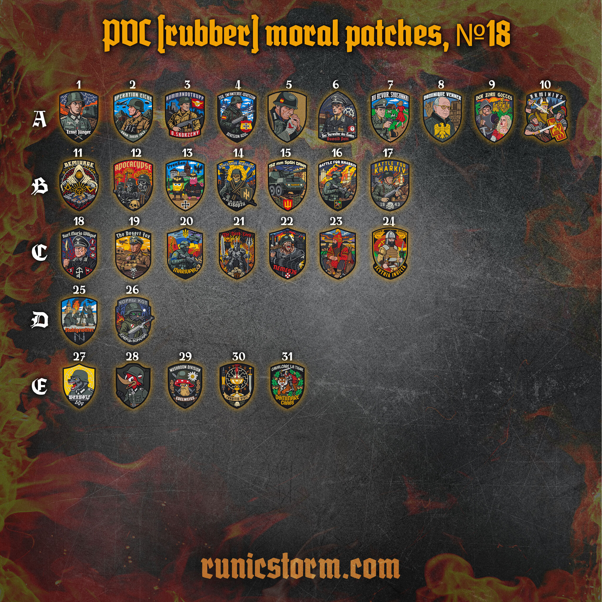 New PVC (rubber) moral patches, panel №18 SKU: W952 Stock Status: 775 Delivery Status: 1-3 days Keywords: #panel Number -- Select -- 01 - The «Ernst Jünger Soldier» PVC patch 02 - The «Operation Eiche» PVC patch 03 - The «Skorzeny Kommandos» PVC patch 04 - The «250th Infatry Division» PVC patch 05 - The «Wounded but Unbroken» PVC patch 06 - The «Der Verwalter des Todes» PVC patch 07 - The «Au Revoir, Shosanna!» PVC patch 08 - The «Dominique Venner» PVC patch 09 - The «Der Zorn Gottes» PVC patch 10 - The «Arminius» PVC patch 11 - The «Demiurge» PVC patch 12 - The «Apocalypse» PVC patch 13 - The «Last Bastion of Prussia» PVC patch 14 - The «Donetsk Airport» PVC patch 15 - The «Manyunya» PVC patch 16 - The «Battle for Kharkiv (2022)» PVC patch 17 - The «Battle for Kharkiv» PVC patch 18 - The «Weisthor» PVC patch 19 - The «Desert Fox» PVC patch 20 - The «Battle for Mariupol (2022)» PVC patch 21 - The «Sauron» PVC patch 22 - The «Nemesis» PVC patch 23 - The «Scythyan Warrior» PVC patch 24 - The «Scythya Invicta» PVC patch 25 - The «Stahlgewitter (GrW 42)» PVC patch -$1 26 - The «Чорны Кот» PVC patch -$1 27 - The «Werwolf» PVC patch -$2 28 - The «Woody Woodpecker» PVC patch -$2 29 - The «Mushroom Division» PVC patch -$2 30 - The «Traditio Vivit» PVC patch -$2 31 - The «Ride the Tiger» PVC patch -$2 $12 Quantity Add To Cart Description There is no description for this product yet.